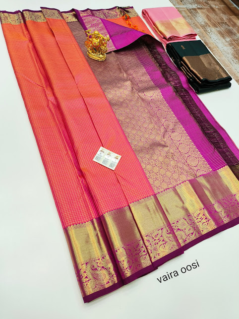Pure Kanjivaram Fancy Silk Saree Double Shade ( Orange, Rose ) Color w/ Blouse