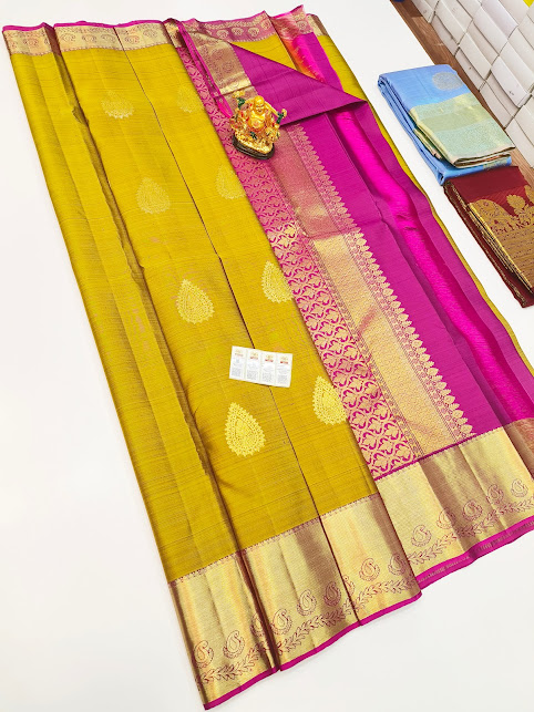 Pure Kanjivaram Fancy Silk Saree Mustard and Pink Color w/ Blouse