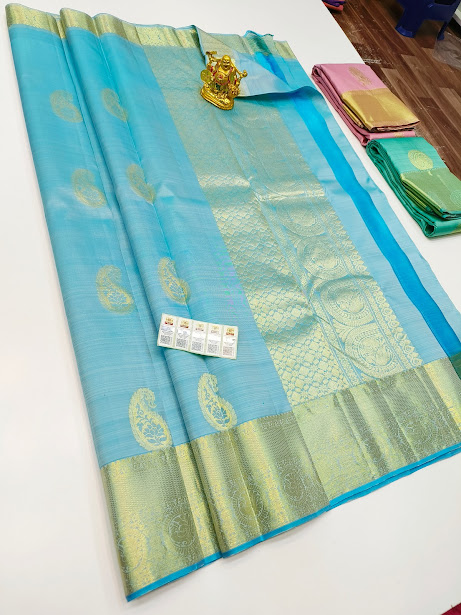 Pure Kanjivaram Fancy Silk Saree Sky Blue Color w/ Blouse