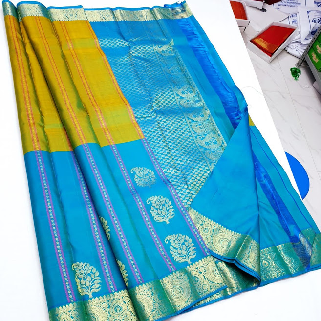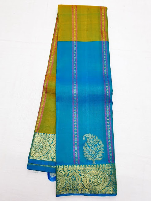 Pure Soft Silk Kanjivaram Saree Mango Design Pear Green and Sky Blue Color