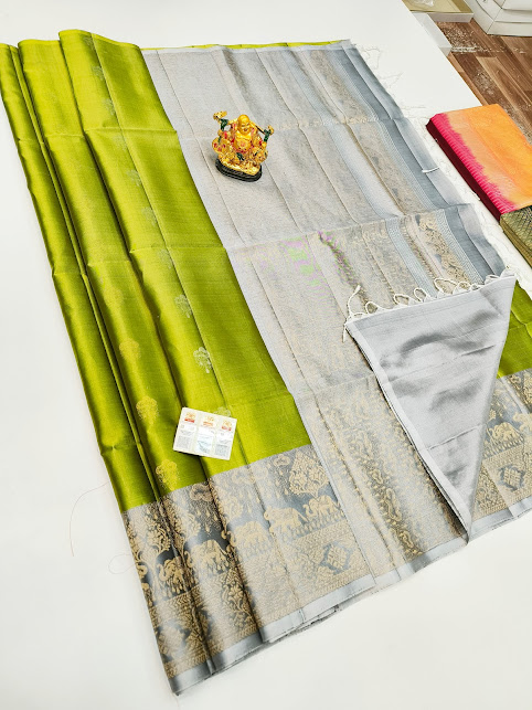 Pure Soft Silk Saree Lemon Green and Gray Color w/ Blouse