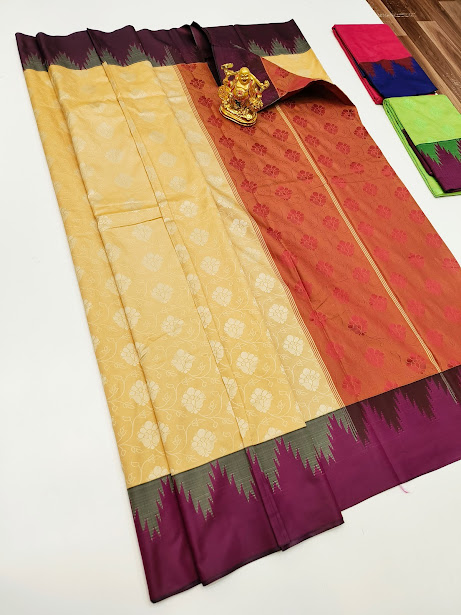 Sandal and Orange Plain Mphoss Saree Art Silk w/ Blouse