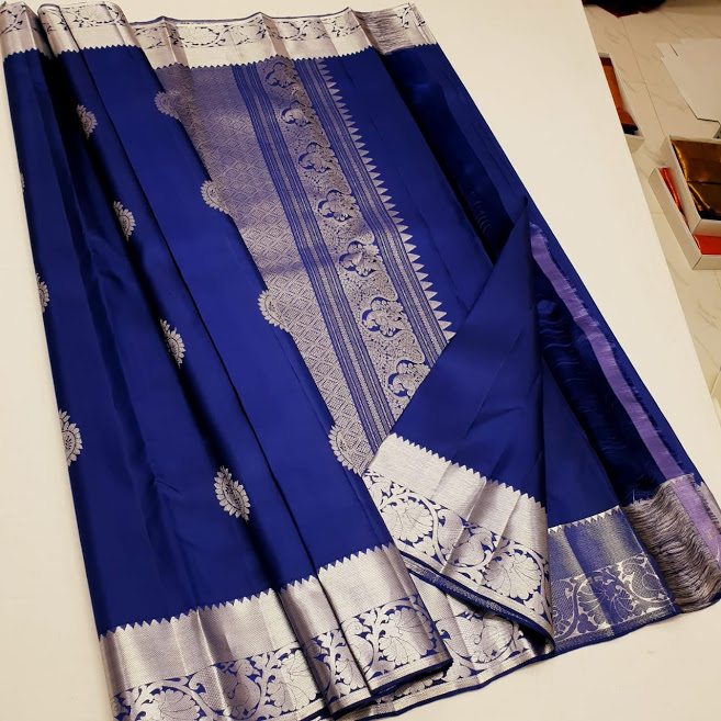 Silver Jari Work Kanjivaram New Annam Design Trendy Silk Saree Navy Blue Color