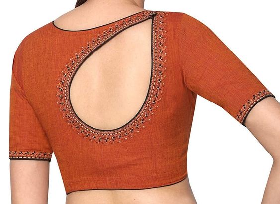 Whats App for Latest Sarees & DesignsThis is a classic blouse design featuring a back neck design with embroidery in an orange color. It is a timeless and versatile look that is perfect to be worn with a variety of outfits and looks great with any color. The embroidery adds a unique touch and can be dressed up or down depending on the occasio