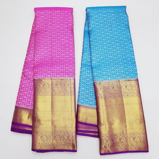 Small Checks Design Kanchipuram pure silk saree bridal collection full koravai small border and big border WEDDING sarees (Rose / Sky Blue)