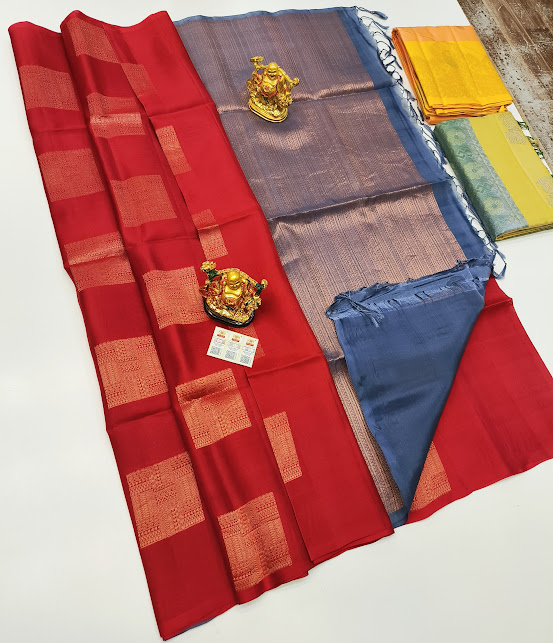 Square Design Pure Soft Silk Saree Chili Red Color w/ Blouse