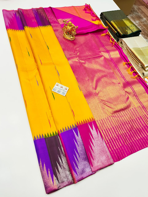 Temple Design Pure Kanjivaram Fancy Silk Saree Yellow Color w/ Blouse