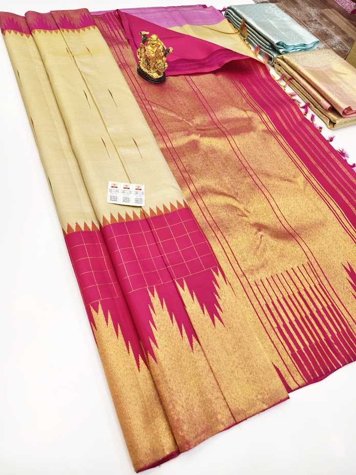 Temple Design Pure Kanjivaram Silk Saree Off White Color w/ Blouse