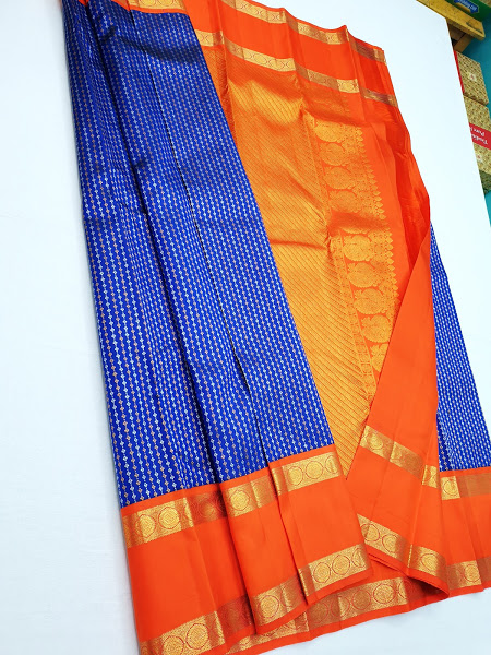 Traditional Design Arrival Kanjivaram Pure Silk Saree Bridal Collection Navy Blue w/ Orange Color