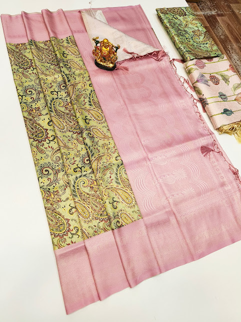 Trendy Design High Fancy Kanjivaram Silk Saree Mix Light Yellow Color w/ Blouse