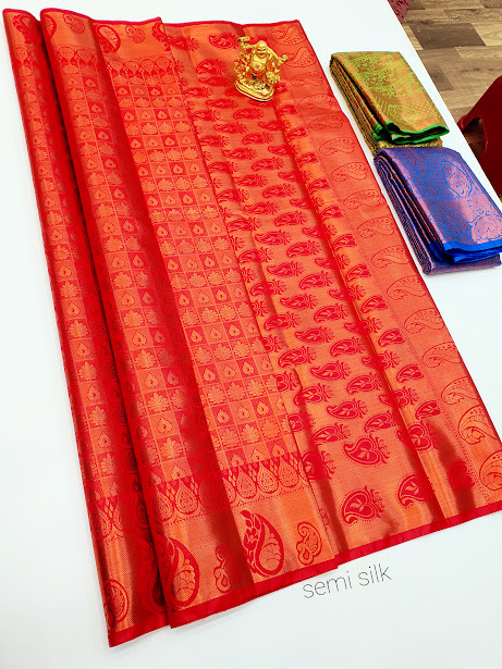 Trendy Design Kanjivaram Semi Silk Saree Apple Red Color