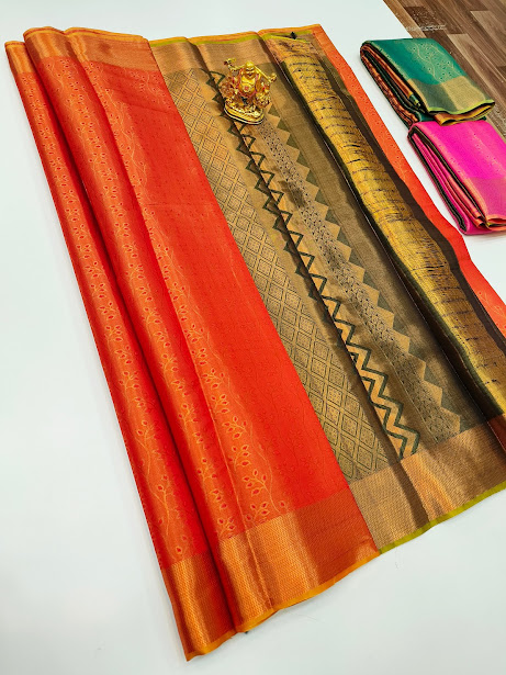 Trendy Design Kanjivaram Semi Silk Saree Orange Color w/ Blouse