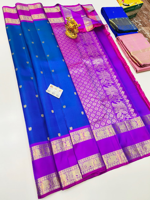 Trendy Design Pure Kanjivaram Fancy Silk Saree Ink Blue Color w/ Blouse