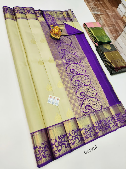 Trendy Design Pure Kanjivaram Fancy Silk Saree Off White Color w/ Blouse