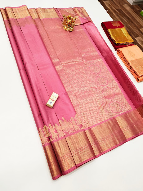 Trendy Design Pure Kanjivaram Fancy Silk Saree Peach Color w/ Blouse