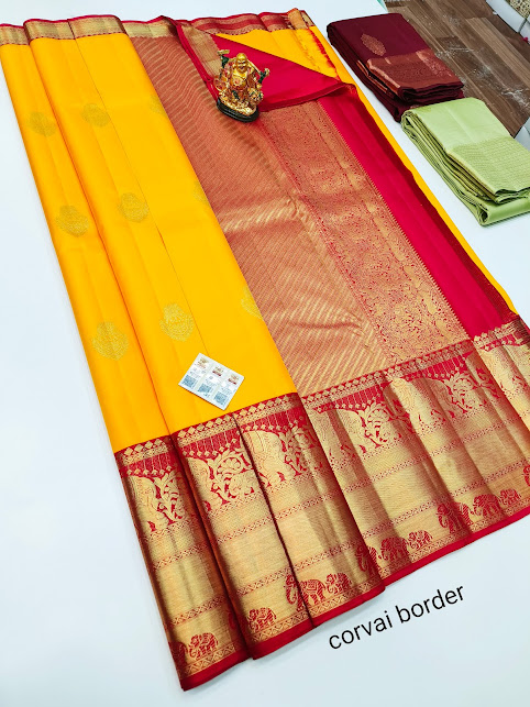Trendy Design Pure Kanjivaram Fancy Silk Saree Yellow Color w/ Blouse