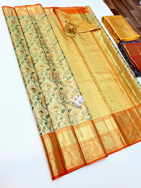 Trendy Flower Design Kanjivaram Pure Bridal Silk Sarees Cream White w/ Orange Color