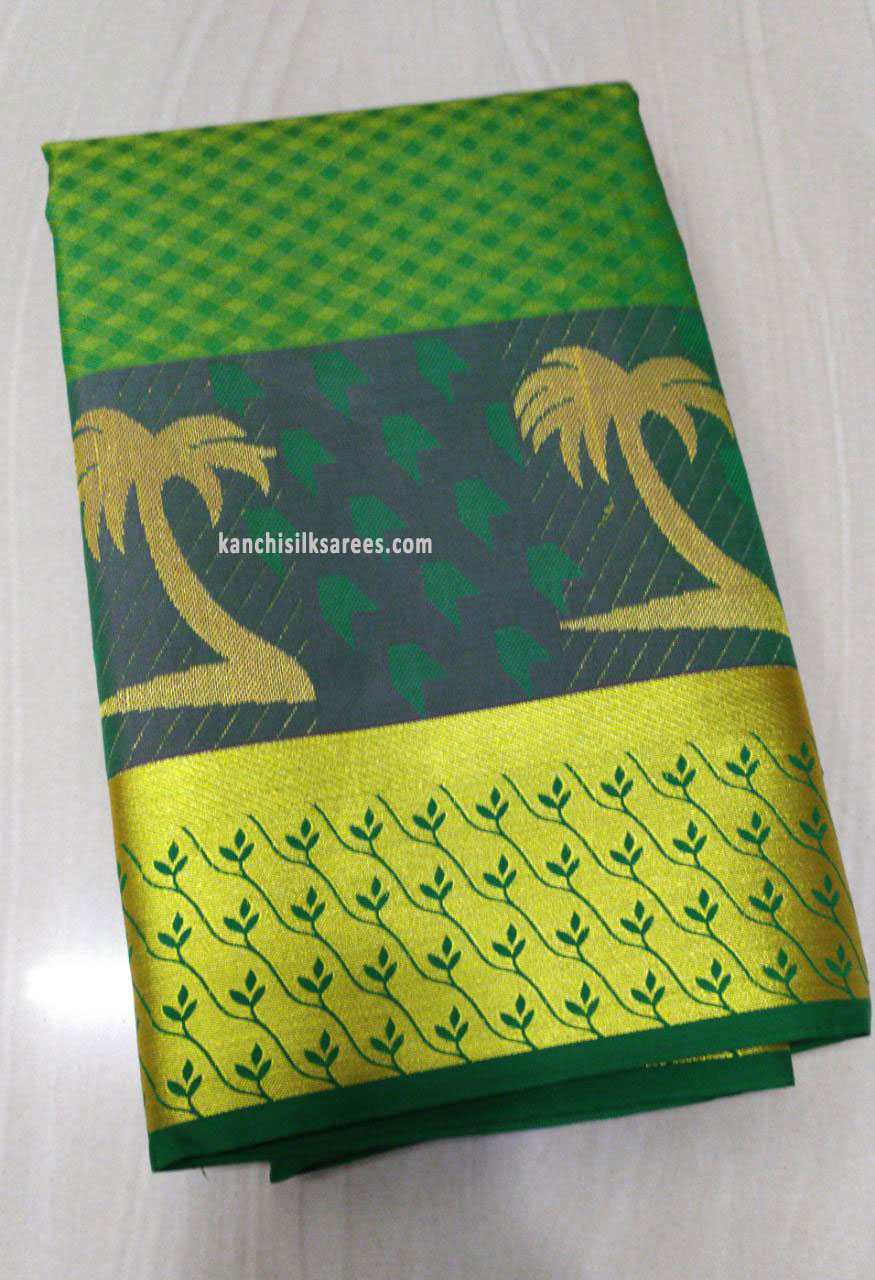 Trendy Kanjivaram Gift Silk Sarees Coconut Tree Design Green Color