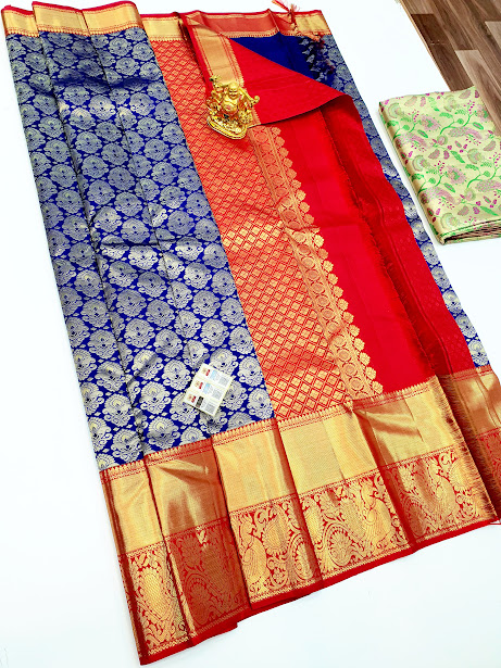 Trendy Latest Design Kanjivaram Pure Silk Saree Ink Blue w/ Red Color