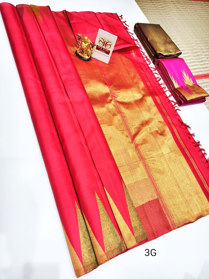 Trendy Temple Design Pure Kanjivaram Silk Saree Pink Color w/ Blouse