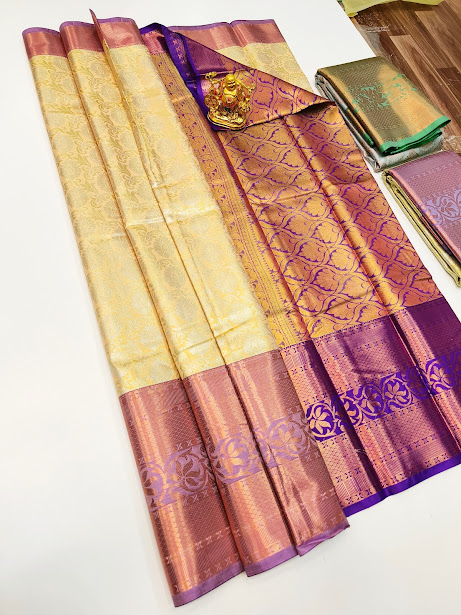 Unique Border Kanjivaram Semi Silk Saree Cream and Violet w/ Blouse