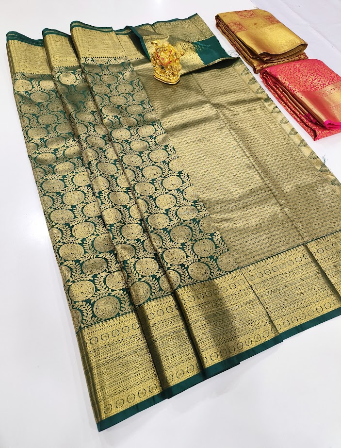 Unique Design High Fancy Kanjivaram Silk Saree Bottle Green Color w/ Blouse