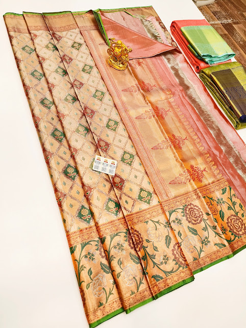 Unique Design Kanjivaram Pure Wedding Silk Saree Cream and Peach Color w/ Blouse