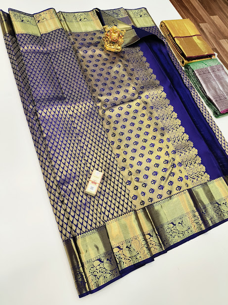 Unique Design Kanjivaram Pure Wedding Silk Saree Indigo Blue Color w/ Blouse