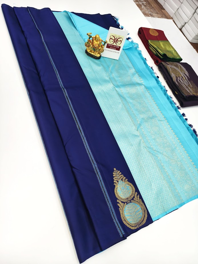 Unique Design Pure Kanjivaram Fancy Silk Saree Ink Blue Color w/ Blouse