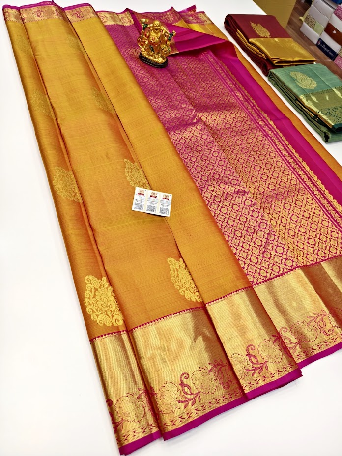 Unique Design Pure Kanjivaram Fancy Silk Saree Mango Yellow Color w/ Blouse