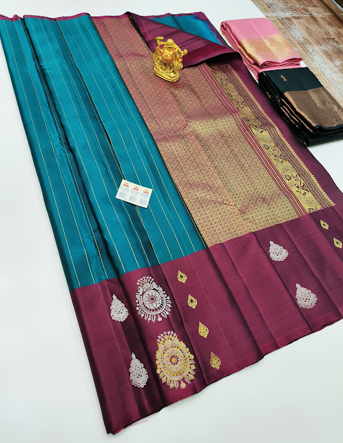 Unique Design Pure Kanjivaram Fancy Silk Saree Peacock Blue Color w/ Blouse