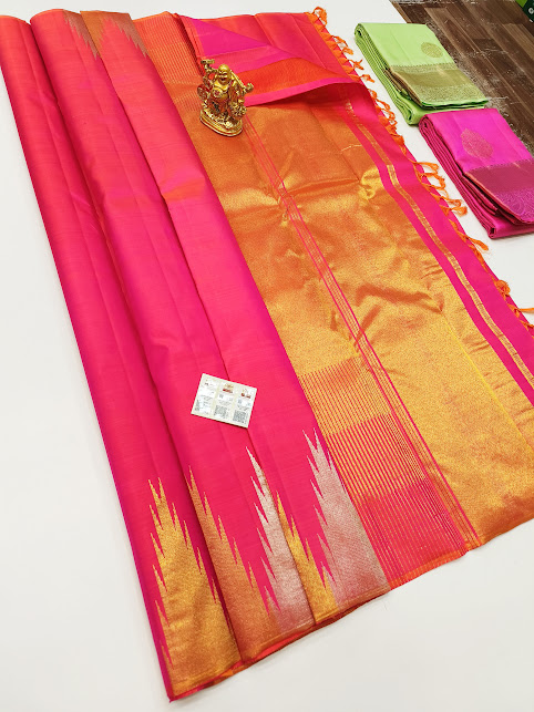Unique Temple Design Pure Kanjivaram Fancy Silk Saree Pink Color w/ Blouse