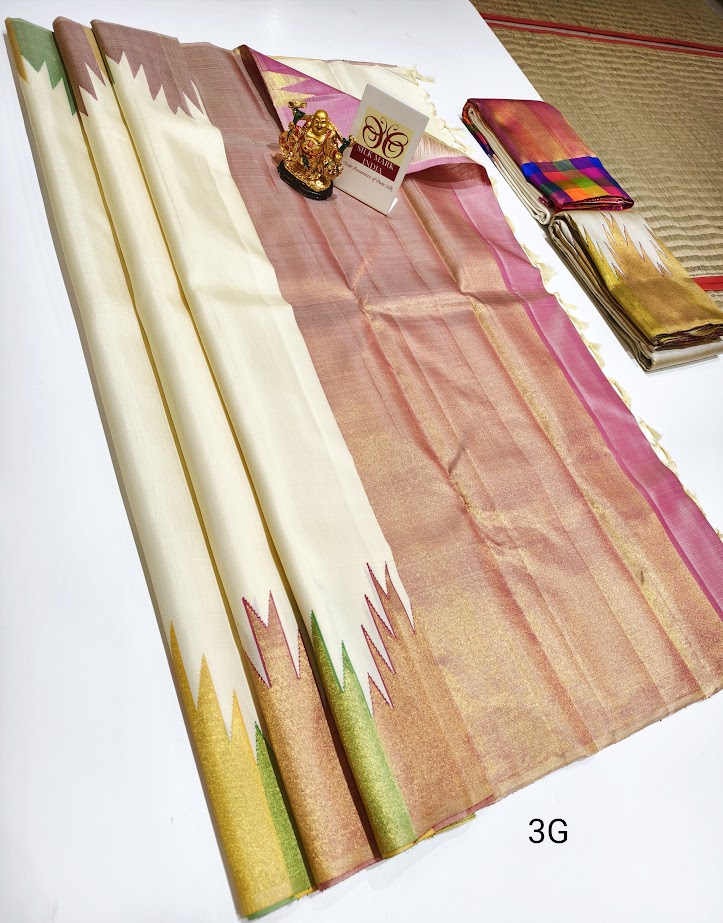 Unique Temple Pure Kanjivaram Silk Saree Cream Color w/ Blouse