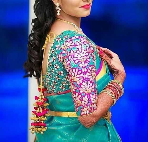 This style of blouse features unique thread and chamki work for a stunning and glamorous look. The thread is done in a variety of colors, with ramar blue and purple being the primary colors. The designs are elaborate and often feature intricate motifs. The chamki work adds a touch of sparkle and glamour to the blouse. The combination of ramar blue and purple in this style of blouse make it a great choice for special occasions.