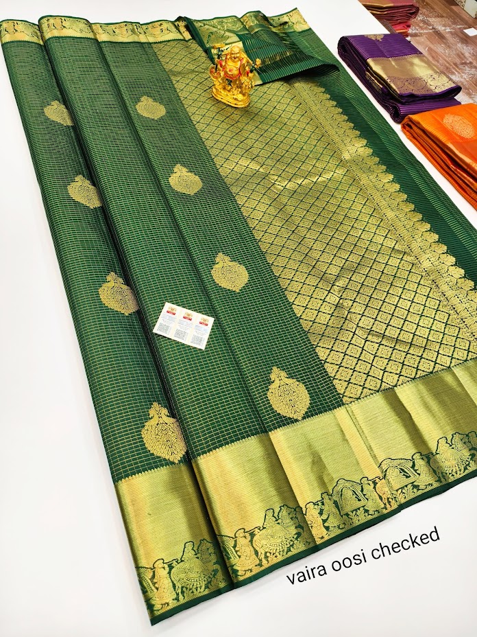 Vaira Oosi Checked Design Pure Kanjivaram Fancy Silk Saree Bottle Green Color w/ Blouse
